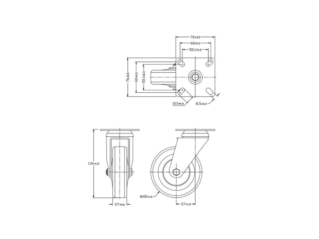 Ø 100 mm | Kolečko otočné bez brzdy: materiál: termoplastická pryž, montážní deska, kluzné ložisko, nosnost 90 kg | 3013A-100